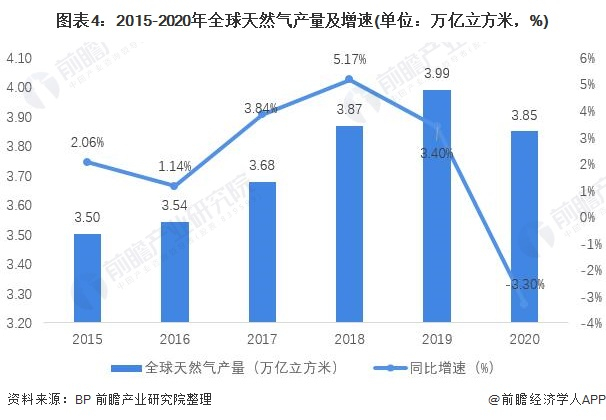 根据英国石油公司(BP)统计数据显示,2015-2019年全球天然气产量呈增长趋势,但增速有所波动。2020年由于新冠肺炎疫情的原因,全球天然气产量为3.85万亿立方米,同比下降3.3个百分点。