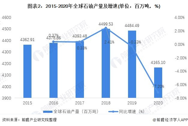 2015-2019年,全球石油产量总体呈现增长趋势。但2020年初由于受到了新冠肺炎疫情的影响,全球范围内工业大规模停摆,石油开采行业运转受阻,导致2020年石油产量大幅度下降。根据英国石油公司的数据,2020年全球石油产量为41.65亿吨,同比下降7.2个百分点。