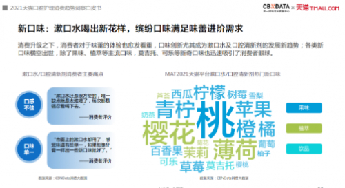 而缤纷的口味出现,也解决了消费者对于漱口水、口腔清新剂口感不佳等痛点,比如桃子、青柠等果味,与樱花、薄荷等植萃口味,另外也有莫吉托、可乐等新奇口味出现。