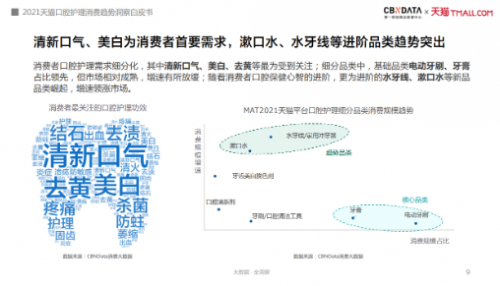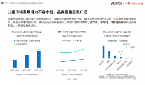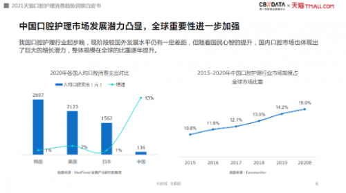 9月19日,第一财经商业数据中心(CBNData)联合天猫发布《2021天猫口腔护理消费趋势洞察白皮书》,依托CBNData消费大数据,概览口腔护理行业发展现状,洞察分析消费人群的画像及特征,并从颜值、品类、场景、生态四大维度总结口腔护理消费新趋势。