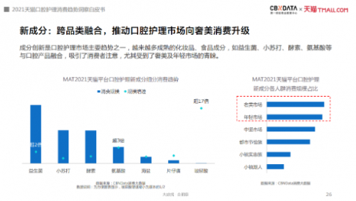 在品类上,成分、形态、口味的创新为口腔护理市场注入新的活力。根据CBNData《白皮书》显示,益生菌、小苏打、酵素等成分逐渐融入口腔产品,其中玻尿酸、氨基酸、益生菌等成分均呈现出较高增速,引起市场关注。消费群体当中,奢美市场与年轻市场最为青睐这些新成分。