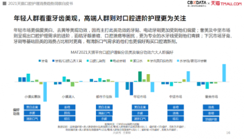 不同人群对于功效的追求也有所差异,奢美市场与中坚市场面临口腔溃疡、牙龈萎缩等问题,更为偏好水牙线等专业进阶的口腔护理产品;年轻市场则更关注美白去黄、杀菌、清新口气等功效,产品上更偏好电动牙刷、牙贴、漱口水等。