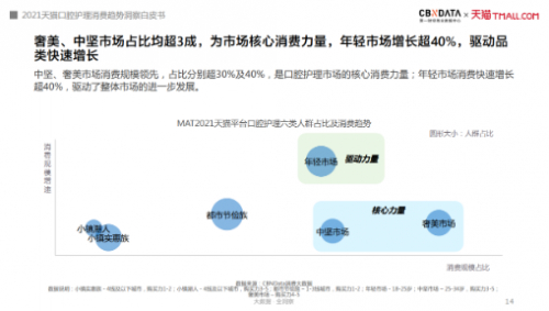 将消费人群根据年龄、城市线级与购买力进行细分,购买力较高的奢美、中坚市场占比分别超过40%和30%,成为口腔护理市场的核心消费力量,而18-25岁的年轻市场以超过40%的增速成为行业的驱动力量。