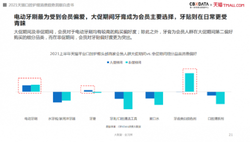 其中,女性、85-95后的轻熟一代与一二线城市的消费者更具有会员意识。相比非促时期,会员人群在年货节、三八节、618等大促节日的下单意愿更强,消费规模占比高于非会员。不管是否在大促期间,会员对电动牙刷的购买偏好度都较为显著,而大促期间会员更偏好购买牙膏,非促期间则更偏好牙贴。