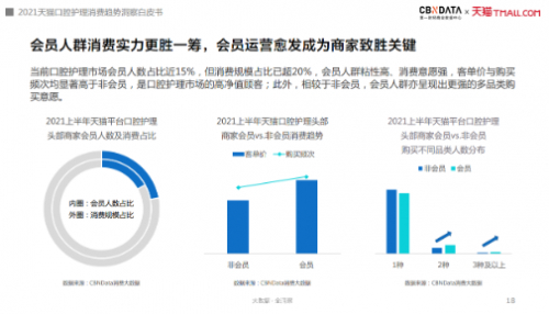 据CBNData《白皮书》,口腔护理市场的会员人数占比近15%,而消费规模占比超20%,其客单价与购买频次也显著高于非会员,且倾向于购买更多不同品类。会员人群凭借着高消费力成为口腔护理品牌商家们关注的重点。