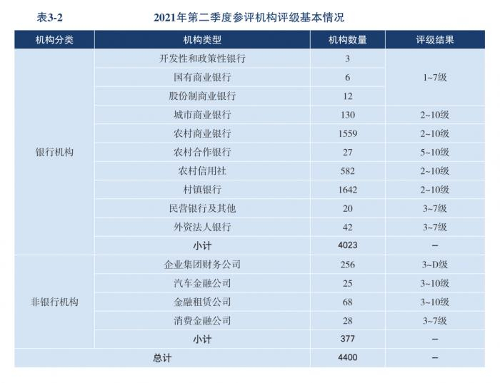 央行金融机构评级等级划分为11级,分别为1-10级和D级,级别数值越大表示机构的风险越高,其中:
