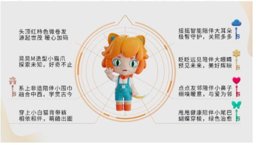 从脖子上寓意着人文陪伴的非遗围巾,到尾巴上代表健康陪伴的蝴蝶;从凝练友邻陪伴的鼻子,从聚焦远见陪伴的眼睛;从聆听智能陪伴的耳朵,到探索未知、好奇不止的M造型小脚印……穿着小白猫背带裤的茂星人,将机灵有趣的猫系陪伴活灵活现得展现出来。