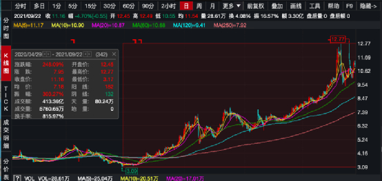 股价方面,探路者从去年低点每股3.09元一路上扬,一年半来股价累计涨近250%。