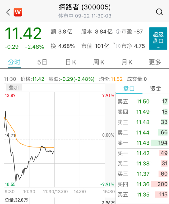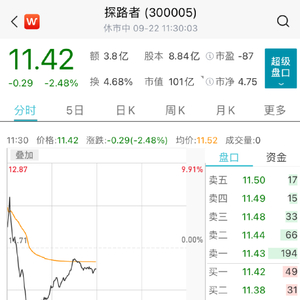 今日早盘,探路者股价冲高后杀跌,先是一度涨近6%,然后又一度跌近9%,截至午盘,探路者跌2.48%,报11.42元/股,市值101亿。