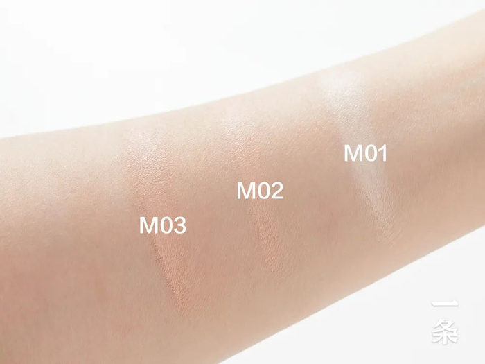 有3个色号可供选择:M01:亮白色,适合肤色非常白皙的人;