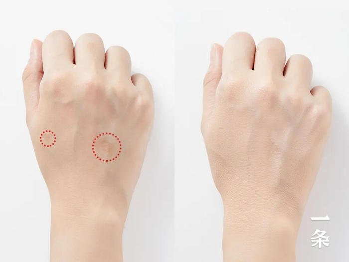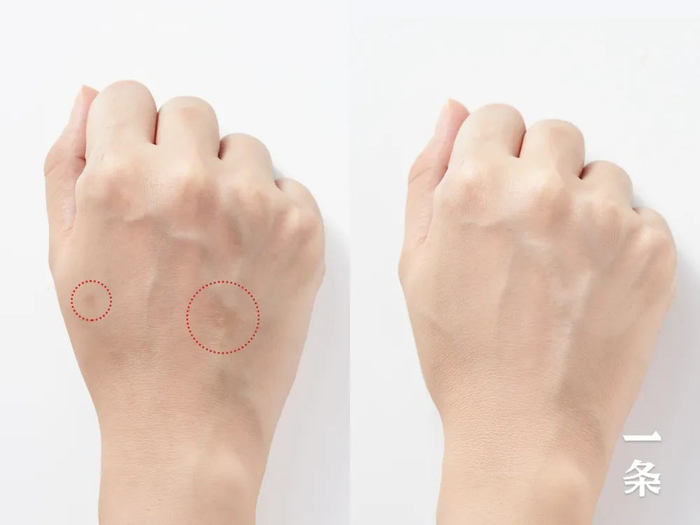 上图是在影棚做的小测试,左边是什么都没有涂的手背,可以看出画圈处有非常明显的瑕疵。