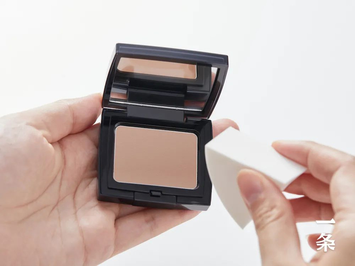 然后用海绵的皮面(圆弧面),蘸取少量粉膏由脸部两侧拍至全脸(注意是轻拍,而不是抹开)。