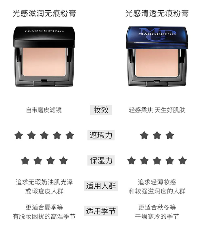 对于皮肤特别干燥的人,还可以选择毛戈平的光感清透无痕粉膏(左)。