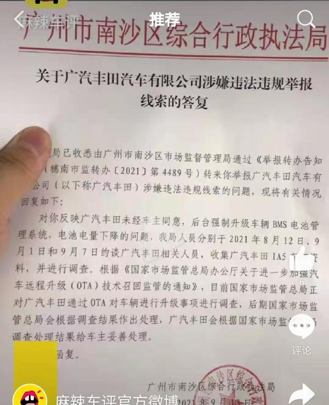 根据该车主发布的照片,《答复》由广州市南沙区综合行政执法局9月13日出具,举报的内容为“广汽丰田未经车主同意,后台强制升级车辆BMS电池管理系统,电池电量下降的问题”。