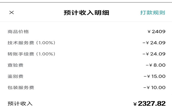 刘源向时代周报记者提供的交易明细显示,一双球鞋售价2409元,交易中会扣除包含技术服务费、转账手续费、查验费等多类手续款项。“商品价格越贵,手续费越高。”刘源表示。