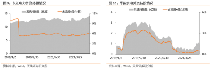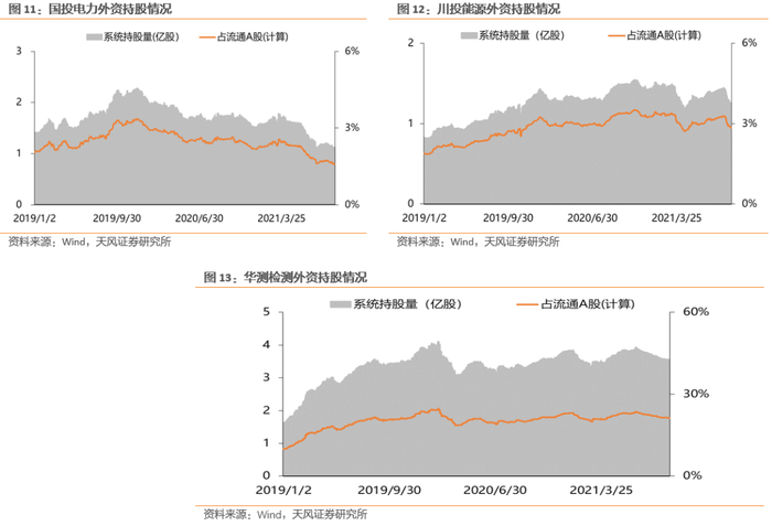 截至2021年9月17日,剔除限售股解禁影响后,长江电力、华能水电、国投电力、川投能源和华测检测外资持股比例分别为6.18%、0.56%、1.60%、2.86%和21.29%。较年初(1月2日)分别变化+0.73、+0.21、-0.58、-0.41和-1.69个百分点,较上周分别变化-0.02、-0.05、-0.02、-0.06和-0.09个百分点。
