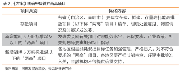 坚决管控高耗能高排放项目仍是政策基调。今年以来,中央有关部门和各地密集调研论证“碳达峰”“碳中和”的时间表、路线图。作为“双碳”工作的前奏,能耗“双控”成为倒逼经济绿色低碳转型的主要抓手。为了完成能耗“双控”任务,控制“两高”项目成为从中央到地方环境资源工作的重中之重。本次《方案》从存量、新增等角度明确了对高耗能高排放项目的管控。