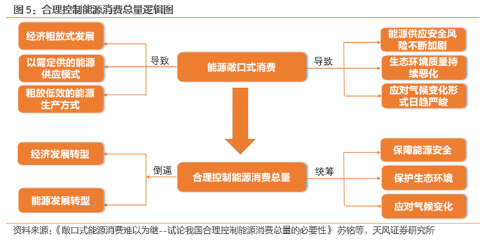 “十二五”期间,首提控制能源消费总量要求并初步建立双控目标责任考核机制。为了应对能源敞口式消费引发的能源安全、环境及气候变化问题,“十二五”期间国家把单位GDP能耗降低作为约束性指标的同时,首提合理控制能源消费总量要求,但未制定具体总量控制目标。《中华人民共和国国民经济和社会发展第十二个五年规划纲要》提出要“合理控制能源消费总量”,并要求“加快制定能源发展规划,明确总量控制目标和分解落实机制”。十八大报告进一步指出要“推动能源生产和消费革命,控制能源消费总量”。