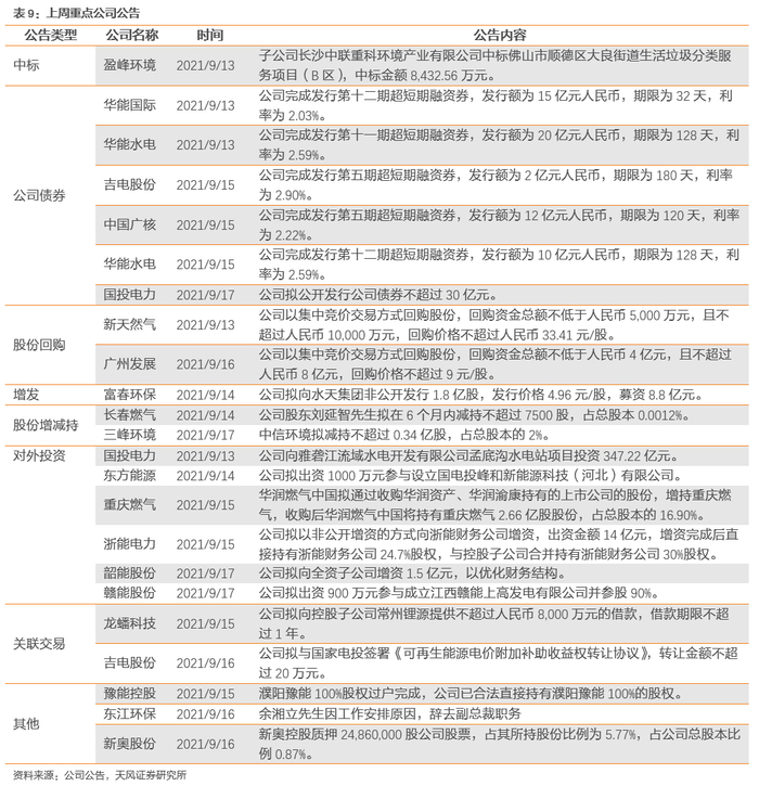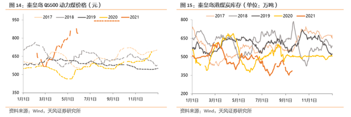 煤价方面,截至2021年9月17日,秦皇岛港动力末煤(5500K)平仓价为942元/吨,较去年同期增加356元/吨,同比变化+60.8%,较2021年2月7日675元/吨环比变化+39.56%。
