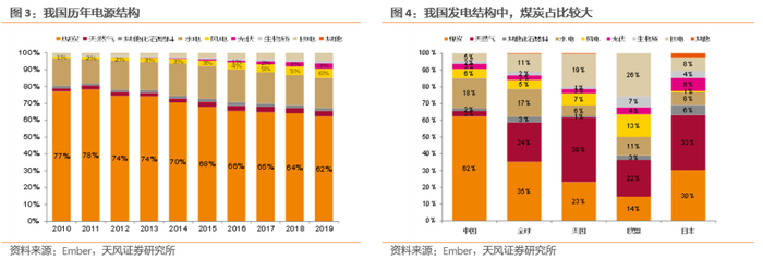 我国电源结构仍以煤电为主。我国正处于工业化、城镇化快速发展阶段,居民生活、交通等领域用能持续增长,能源消费持续保持刚性增长态势;其次我国经济结构中高耗能产业比重较高,用能结构依然以煤炭为主,2020年煤炭发电占比达61%,能源利用方式仍然比较粗放。虽然“十四五”规划纲要给出了非化石能源占能源消费总量比重提高到20%左右的目标,但是化石能源不太可能马上退出,在降低GDP单位能耗的过程中做好化石能源与非化石能源之间的有序衔接至关重要。