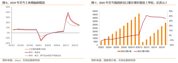 疫情后经济处复苏通道,多地出现“双控”困局。工业生产方面,今年以来我国规模以上工业增加值同比增速明显高于历史同期水平,二季度单月增速也均保持在8%以上。进出口方面,全球经贸环境正在逐渐改善,国际货币基金组织预计今年全球经济增长6%,这有利于我国进出口的增长,今年以来我国进出口同比增速均保持在20%以上。