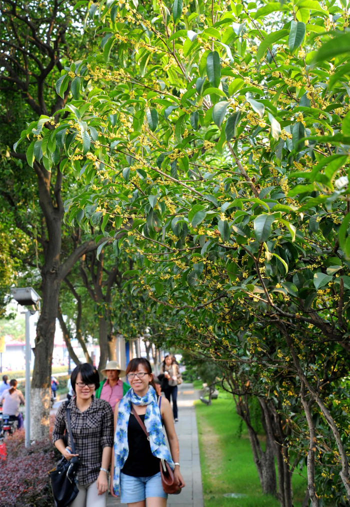 行人从苏州市临顿路旁盛开的桂花树前走过。新华社发