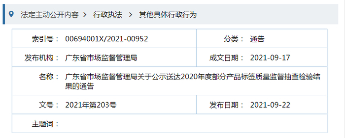 广东省市场监督管理局关于公示送达2020年度部分产品标签质量监督抽查检验结果的通告