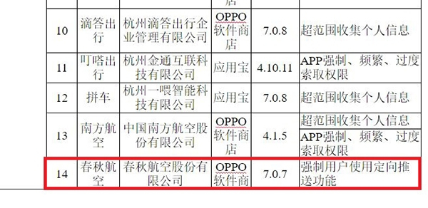 其中,春秋航空股份有限公司旗下春秋航空APP(版本:7.0.7),存在强制用户使用定向推送功能问题遭工信部通报。