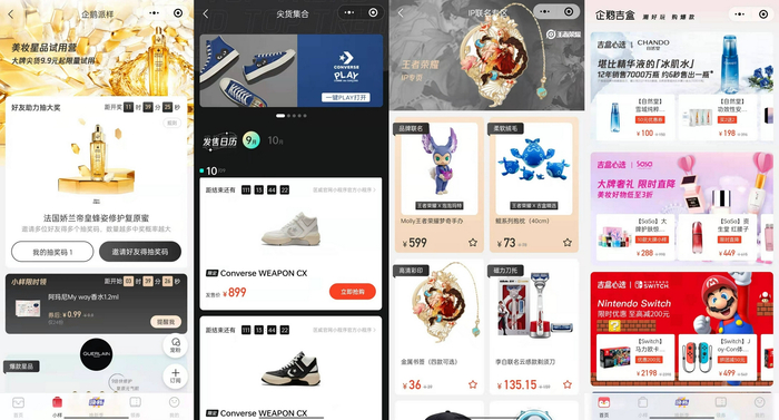 企鹅派样汇集了大牌美妆明星产品的小样,该页面中用户可以限时体验价抢购试用装并领取品牌优惠,此外还有抽取产品正装的活动;尖货日历专区会呈现和预告近两个月内品牌限定款、热门爆款等尖货的发售计划,用户可直接在该页面预约抢购提醒,或跳转至品牌官方小程序购买;吉盒心选专区集合了众多一线大牌合作,为消费者优选品牌爆品、新品,并且每周上新;潮鹅联名专区精选了王者荣耀、《你是我的荣耀》、QQ Family等腾讯知名IP的官方联名款商品。