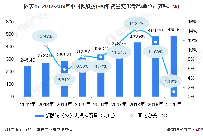 目前国内尼龙产业竞争力近年来提升较快,消费量保持稳定增长, 2019年我国聚酰胺(PA)消费量增加至483.2万吨,同比增长11.68%,2020年中国聚酰胺(PA)消费量为488.5万吨,同比增长1.10%。