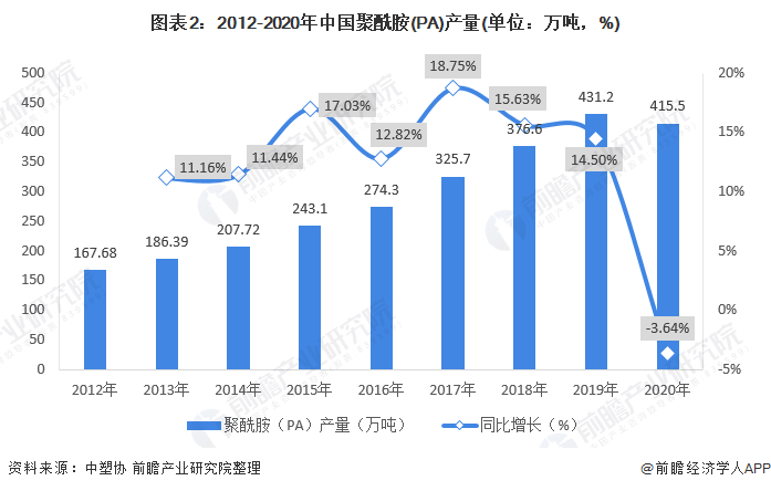 2012-2020年,中国聚酰胺(PA)产量逐年增长,2018年中国聚酰胺(PA)产量达到376.6万吨,同比增长15.6%。2020年我国聚酰胺(PA)产量已经达到415.5万吨,同比下降3.64%。