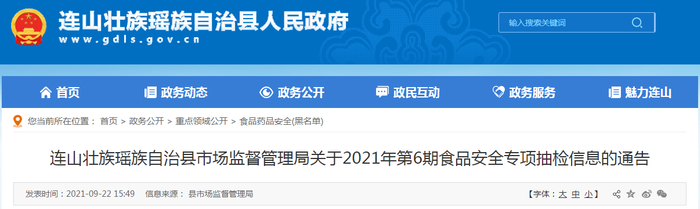 广东省连山壮族瑶族自治县市场监管局抽检105批次食品 3批次不合格
