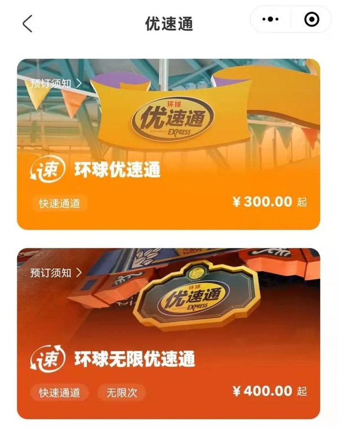 目前,北京环球影城的优速通分为300元和400元两种,前者在所选日期内可优先打卡园内配有优速通通道的游乐项目、演出各一次,后者则可以在所选日期内对这些项目或演出一天内多次优先打卡。