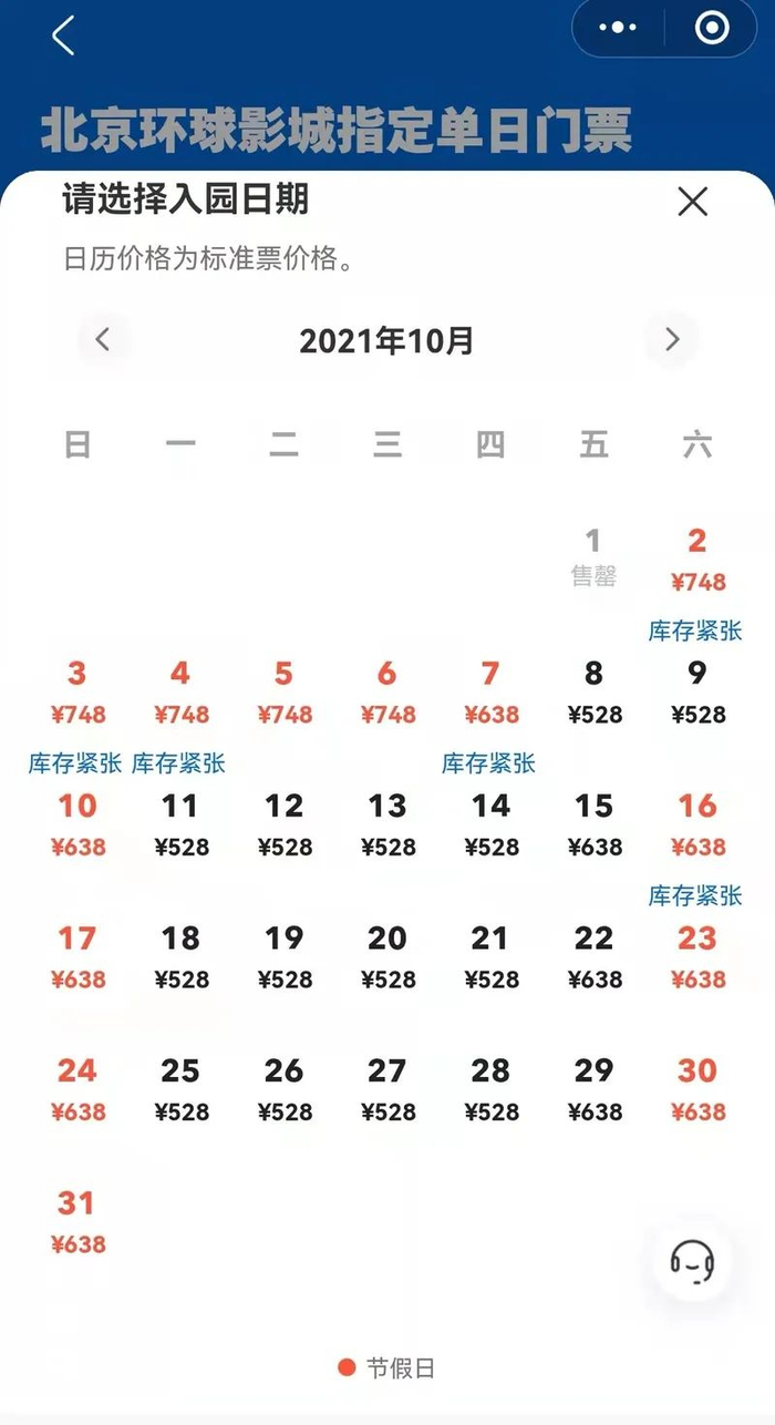 “十一”黄金周期间,北京环球影城10月1日和10月7日成人票价为638元,10月2日至10月6日票价748元。10月8日至10月9日回归平季日票价528元。北京环球度假区官方小程序页面显示,10月1日的门票已经售罄,10月2日至10月4日、10月7日这四天的门票为“库存紧张”状态。