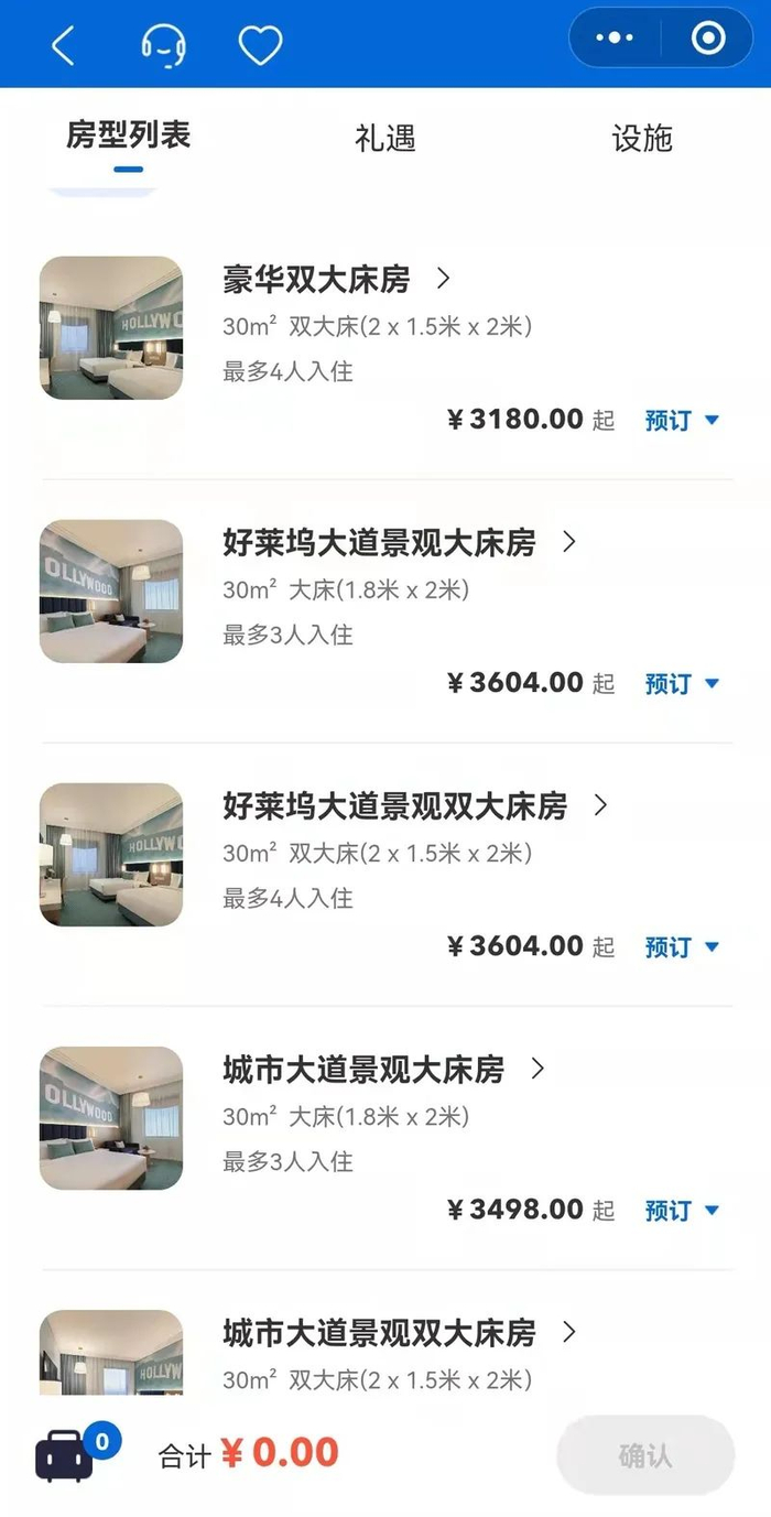 住宿上,北京环球度假区包含了两家酒店。其中,乐园出口处的环球影城大酒店主打美式风格。官方小程序显示,该酒店10月1日的豪华双床房价格为3180元,其它房型价格从3498元到更高不等,也有部分房型已经订满。