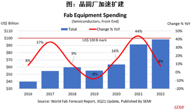 根据SEMI的数据显示,2021年的全球设备投资额同比增速创历史新高,达到44%,在今年投资额高基数的前提下,明年将保持8%的同比增速,半导体设备需求持续扩大。