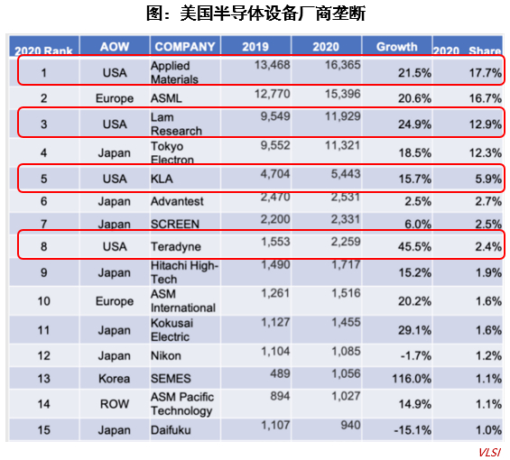 另外,全球半导体设备厂商中,前十大厂商有4个来源于美国,合计市占率高达42.2%,几乎垄断了半导体设备的半壁江山。中芯国际光刻设备尚未实现国产化,刻蚀(刻蚀是用化学或物理方法有选择地从硅片表面去除不需要的材料的过程,其基本目标是在涂胶的硅片上正确地复制掩模图形。)设备非核心环节可国产化,检测设备国产化率低。但这种背景,国内芯片制造的发展,明显被美国掣肘,中芯国际在后期仍将较长时间内处于美国压制的环境下。