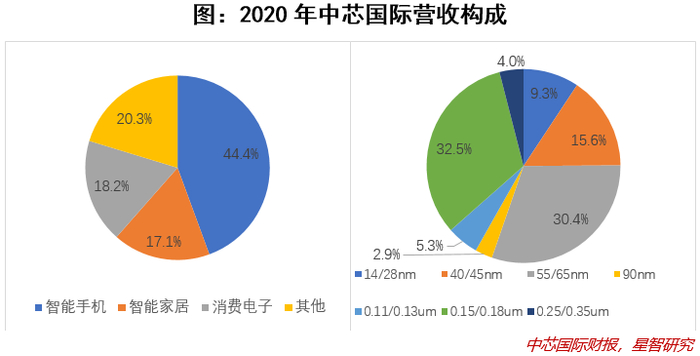 分制程来看,2020全年营收的9.3%来自14nm和28nm,其余均来自45nm及以上的成熟制程,其中最主要的40/45nm、55/65nm和0.15/0.18um分别占15.6%、30.4%和32.5%。由于主要营收来自于45nm以上成熟工艺,因此主要的产品应该是普通逻辑处理器、电源类模拟芯片、射频芯片等。