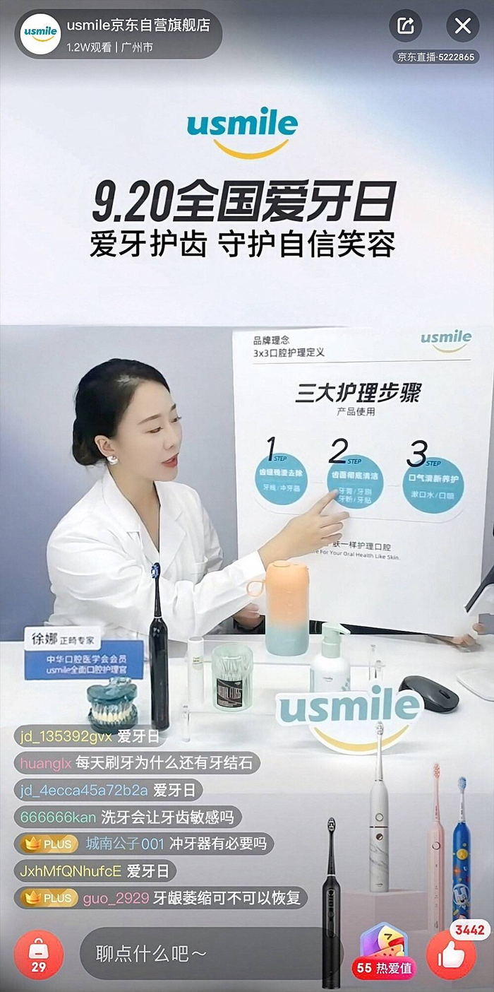2021 年 9 月 20 日,是第 33 个「全国爱牙日」,也恰逢中秋。全面口腔护理品牌 usmile 以「笑容守护官」的身份,联合专业牙医团队,举办了一场围绕「口腔护理」主题的线上直播,为用户科普了口腔健康的相关知识,也在互动环节,与粉丝进行面对面的答疑交流。