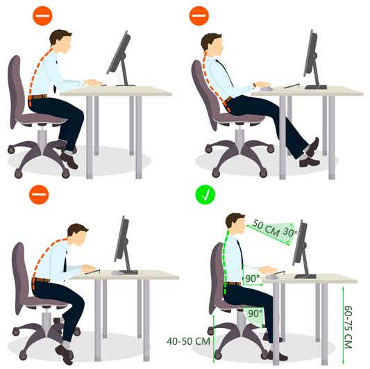 正对办公桌,在椅子上挺直坐好。良好的坐姿应是颈部、后背和腰部在一条竖直的直线上。后背有椅背依靠,如果无法靠在椅背上,可以加一个靠枕或腰垫。 | |