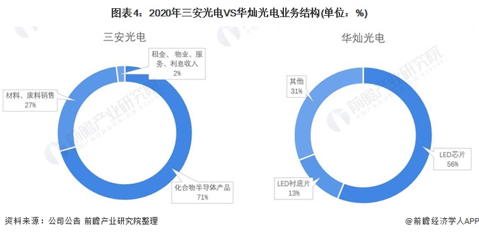 在产业链布局方面,两家公司均深耕LED芯片行业。三安光电的产品包含化合物半导体产品,材料、废料销售和租金、物业、服务、利息收入三大类。其中,化合物半导体产品(外延片、芯片)是公司最核心的业务,2020年占比为71%;华灿光电的产品主要包含LED芯片、LED衬底片、其他类,其中,LED芯片业务占比达56%。