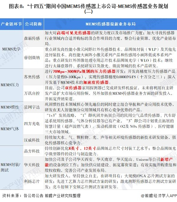 根据“十四五规划和2035年愿景目标纲要”,“十四五”期间,我国MEMS传感器行业是“十四五”时期重点发展的战略新兴产业。此外,MEMS传感器企业的其他上市公司也明确了其MEMS传感器业务的发展布局: