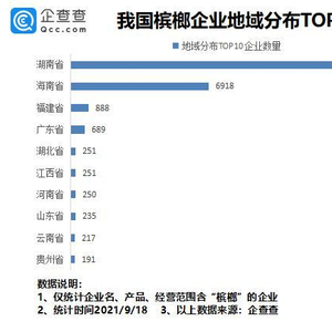 企查查数据显示,从地域分布来看,目前我国拥有槟榔相关企业绝大多数分布在湖南,共有1.56万家槟榔相关企业,位居全国第一;海南、福建排第二、三名,分别为6918家、888家。其次是广东、湖北、江西等省份。