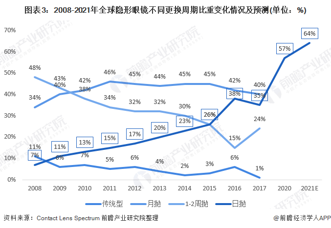 从Contact Lens Spectrum发布的全球隐形眼镜近10年的更换周期变化曲线可以看出,日抛是增幅最快的短周期型产品;传统型镜片的比重处于一个较低的水平,短周期镜片保持主导地位。当《Contact Lens Spectrum》的读者被问及2021年他们更期待使用哪种软性镜片时,57%的人表示日抛类 (2020年为64%)。