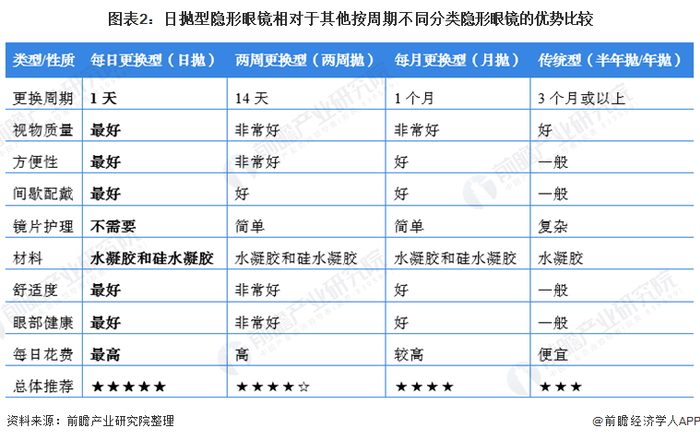 从近年来全球隐形眼镜的市场规模的变化也能看出,隐形眼镜的接受度逐渐增加。但是隐形眼镜的最大缺点之一就是容易引起眼部的炎症,为了眼部卫生,隐形眼镜的使用周期才会越来越短的,日抛的隐形眼镜不需要护理,一次性佩戴,减少与外界,护理液,隐形眼镜盒,人手等的接触,杜绝了细菌滋生的途径,所以才更安全。这些特性使得其受到越来越多的消费者的青睐。日抛型隐形眼镜相对于其他按周期不同分类隐形眼镜的优势比较如下: