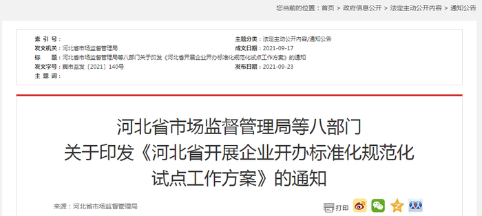 河北省市场监督管理局等八部门关于印发《河北省开展企业开办标准化规范化试点工作方案》的通知