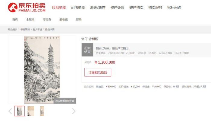 9月21日,起拍价40万元的中国国画大师张大千的原作《山厨清供》以80万元高价成交!而这,还不是当晚的最高成交价。另一位著名国画家张仃的原作《舍利塔》,在经历过31轮竞价后,最终以120万元成交,成为京东拍卖&十竹斋书画拍卖专场活动的“标王”。