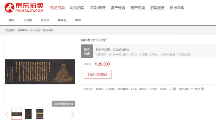此外,历代书法中经典的“写经”题材,在本次京东拍卖&十竹斋书画拍卖专场活动中也广受欢迎。黄秋原的作品《楷书“心经”》以2万元落槌。作为一名70后的书法家,黄秋原擅长“唐人遗墨”,其书法作品按照唐代笔法和规范,纸张、金粉等材料亦参照唐代风格,书法结体整齐缜密、运笔精到、装裱精致,颇有唐人写经的真味,想必拍下这幅佳作的藏家,定能从这一纸作品中窥探到大唐的古韵。