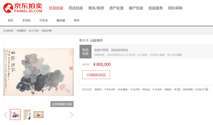 原标题:近20万人次围观 张大千原作《山厨清供》80万元“落槌”京东拍卖 来源:网络