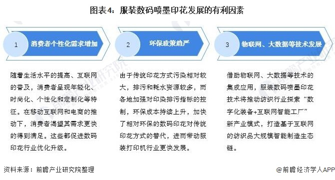 影响服装数码喷墨印花需求的有利因素包括消费者个性化、即时满足的需求日益增加,纺织服装需求的增长及品质的提升,环保政策变化,数码喷墨印花使用成本的降低等,由于传统印染在能耗及排污等方面存在诸多问题,而数码喷墨印花采用绿色清洁喷印技术,具有无需制版、节能环保等显著优点,符合我国目前对纺织印染行业环保低碳、可持续发展的要求。